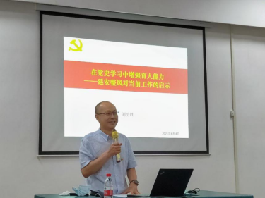 刘勇胜副董事长以“延安整风”为主线,从整风运动的历史背景、历史条件、以及整风运动的基本过程和深远影响四个方面深入浅出地介绍了我党历时四年的一次思想更正的大运动,强调了延安整风对当前工作的启示及在党史学习中增强育人能力的要求。他提到,我们应加强党史学习,增强党性,全党思想的高度统一是党内政治生态建设首要任务;实事求是,发挥学科特色优势,建设地球科学领域国际知名一流大学;全校上下应遵守纪律,严明纪律、团结统一,才是凝聚事业发展的磅礴力量。同时,他指出,师生应落实习近平总书记在党史教育动员大会报告上的指示,学党史,增党性,促进德智体美劳全面发展,做好社会主义建设的接班人。