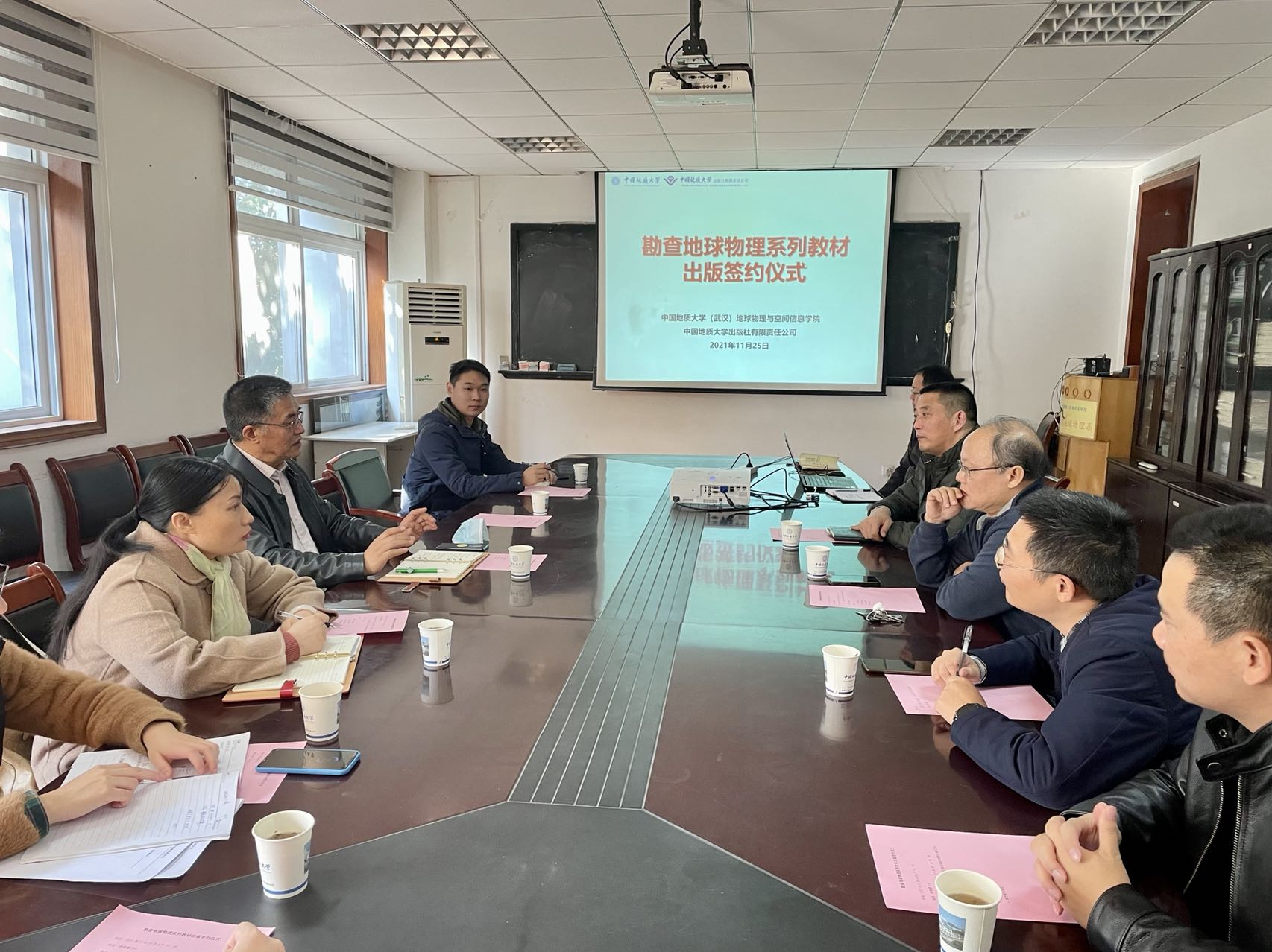 20211125日,太阳成集团tyc234cc出版社与公司在物探楼214举办勘查地球物理系列教材签约仪式,会议由马彦周书记主持。罗银河副经理介绍勘查地球物理系列教材建设情况。太阳成集团tyc234cc出版社社长毕克成介绍了近年来教材和专著出版情况,并从系列化教材建设与研究成果出版给出建议。熊熊经理介绍了​太阳成集团tyc234cc一流专业建设情况,并从教材、课程、人才培养等方面介绍了公司发展规划。