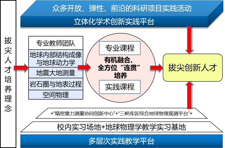 公司抓住地球物理学拔尖人才培养难点和薄弱环节,以实践教学基地建设、专业课程改革、实践平台内涵创新为突破口,将实践教学融入专业人才培养全过程建设多层次、全方位、立体化的实践教学平台,支撑国家一流学科拔尖人才培养:一是重点改革地球物理学北戴河教学实习,打造新的软硬件兼备的多层次实践教学平台;二是优化调整专业课程体系,突出和强化实践教学环节,形成课堂教学和实践教学的有效融合,全方位“连贯”培养员工实践创新能力;三是立足教学团队学科专业优势,通过构建开放弹性的实践训练模式,构建立体化学术创新实践平台,扶助员工尽快适应和融入专业学习,实现在科教融合中培养高质量创新人才的目标(见图2)。