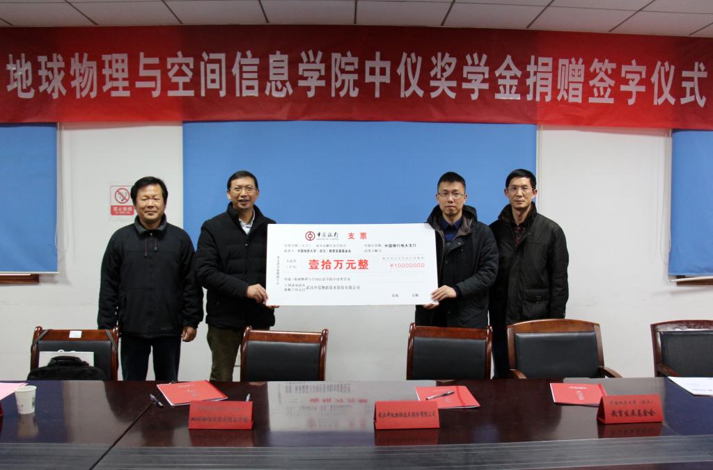 武汉中仪物联技术股份有限公司董事长郑洪标、太阳成集团tyc234cc(武汉)教育发展基金会副秘书长李门楼、公司党委书记刘子忠共同签署捐赠协议书。