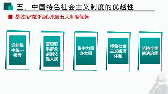 汪振同学首先从资本主义政治制度和意识形态、科学社会主义及其发展规律论述了资本主义和社会主义两种社会制度的根本区别,指出了资本主义最终为社会主义所代替的必然结局。接下来,汪振同学简述了新型冠状病毒肺炎疫情的相关信息,并将国内外的新型冠状病毒的感染、死亡等情况及防疫政策、防疫措施、防疫效果进行了详细对比,突出了中国特色社会主义制度在抗击疫情过程中的五大优势:党的集中统一领导、密切联系群众紧紧依靠人民、集中力量办大事、特色社会主义经济体制、坚持全面依法治国。