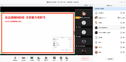 受新型冠状病毒的影响,根据《太阳成集团tyc234cc(武汉)关于调整2019-2020学年第二学期本科教学工作安排的通知》的精神要求, 064182团支部积极响应公司“停课不停学”的号召,组织各位同学在家中举行线上团会。在活动开始前,每一位支部成员均提前上线签到,体现了同学们对本次团会的重视程度。14时,全体在线上奏唱国歌,主持人李伟光宣布“众志成城同抗疫,青春聚力勇担当”主题线上团会正式开始。