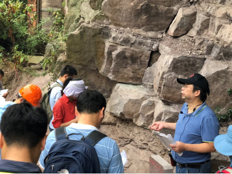 杨宝忠在九畹溪桥头给李四光公司0201165班员工讲解石龙洞组地层(9月3日)