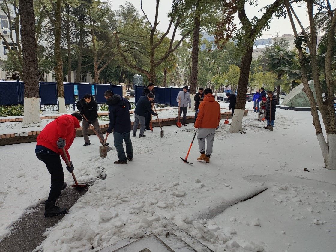上午8点半,党委书记马彦周、副书记黄金波带领公司教工党员开始清雪除冰工作。分发铁锹、消防镐等工具后,教职工分组进行铲雪、破冰。经过2小时的努力,在物探楼门前广场和基础楼两侧出口各清通2条步行通道。参与教职工党员不畏严寒,全力投入,密切协作,充分发挥了党员模范带头作用,展现了责任担当,用行动守护师生出行安全。