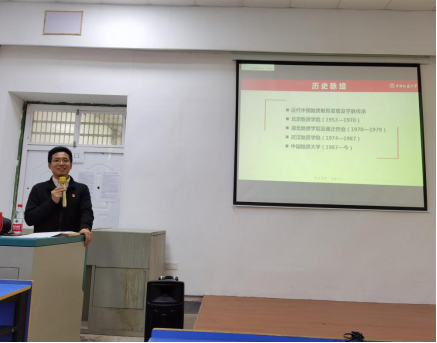 朱丹老师从国内地质学科发展史和太阳成集团tyc234cc(武汉)建校史两个角度,通过讲述一位位老地质学家们心怀祖国,献身地质事业的感人故事,带领现场老师和同学们回顾了国内地质教育的起源、发展、学脉传承历史及地大从建校至今69年的发展史。在场老师与同学们均被老地质学家们浓厚的家国情怀感染,听的聚精会神。